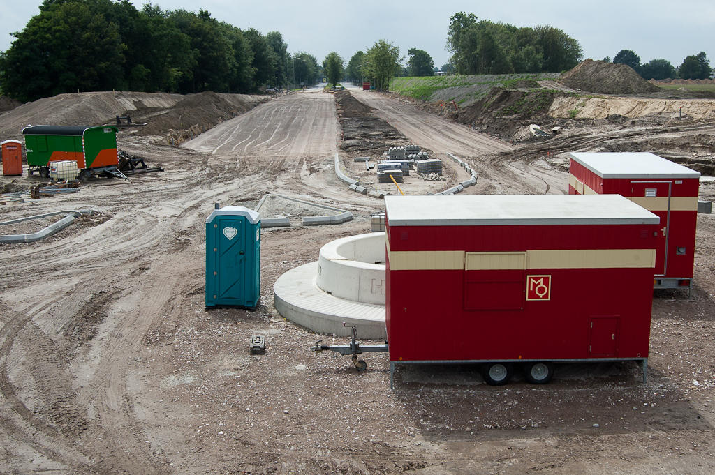 | Aan de beginnende formatie van opsluitbanden in de kruising Hovenring is meteen al te zien dat men het linksafslaand verkeer dwingt voorlangs te rijden. Misschien met een verkeerstechnische reden, maar wellicht vooral om de kans op het aanrijden van het middelpunt met de 70 meter pyloon te minimaliseren. |